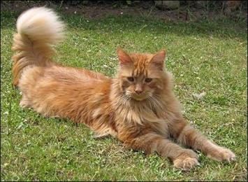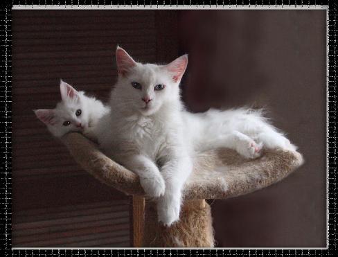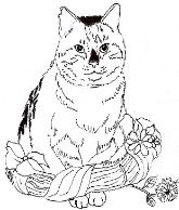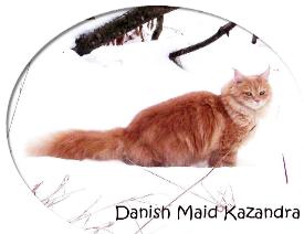 | While The Merry Maines was in the works, after a great amount of help from Kazandra Holm Moller, a dear friend and fellow Maine Coon breeder in Denmark, who proofread the manuscript and expressed a desire to have it printed in Danish, I started on the Moosery. And sent along chapters to Kazandra to work on. By this time, however, it was known among her friends that Kazandra had breast cancer. She was bed-bound and could do little except read. To keep her mind on other things, she asked that I keep sending her chapters of the new book and in the doing, thinking it might give her a smile, I changed the name of one of the Moosery characters to Hallecoons Danish Maid Kazandra and modeled her after Cremy (Coonmtn Crème Delight), one of the queens Kazandra had taken home with her after a cat show in Augusta, Georgia while she was still healthy and deeply involved with the Maine Coons in Denmark and the Netherlands. She sent me this photo and I felt Cremy was the perfect model for 'Zandra. |